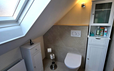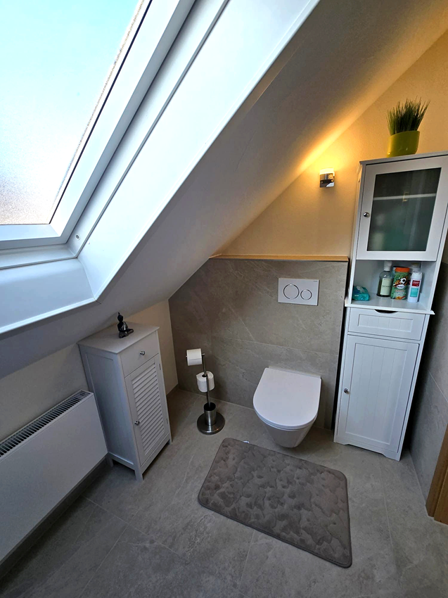 Das Ergebnis ist ein kleines, aber äußerst gemütliches Dachgeschossbad, das Funktionalität und Komfort perfekt verbindet. Dank der sorgfältigen Planung und fachgerechten Umsetzung entstand ein Badezimmer, das den vorhandenen Raum optimal nutzt.