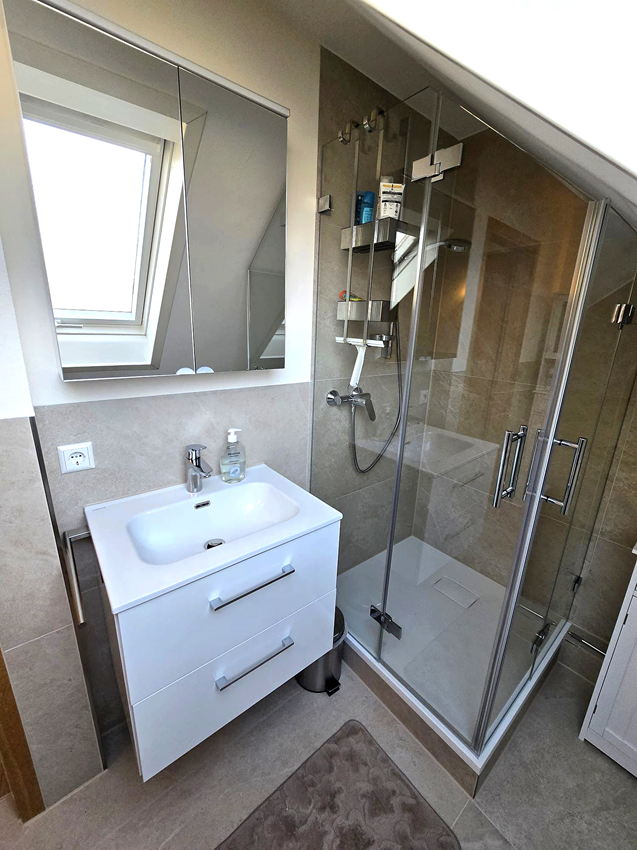 Bereits in der Planungsphase wurde gemeinsam mit den Kunden ein Konzept entwickelt, das die besonderen Gegebenheiten eines Dachgeschosses – wie Dachschrägen und begrenzte Raumhöhe – optimal berücksichtigt. Durch eine durchdachte Aufteilung und passende Sanitärobjekte konnte der vorhandene Platz effizient genutzt werden.